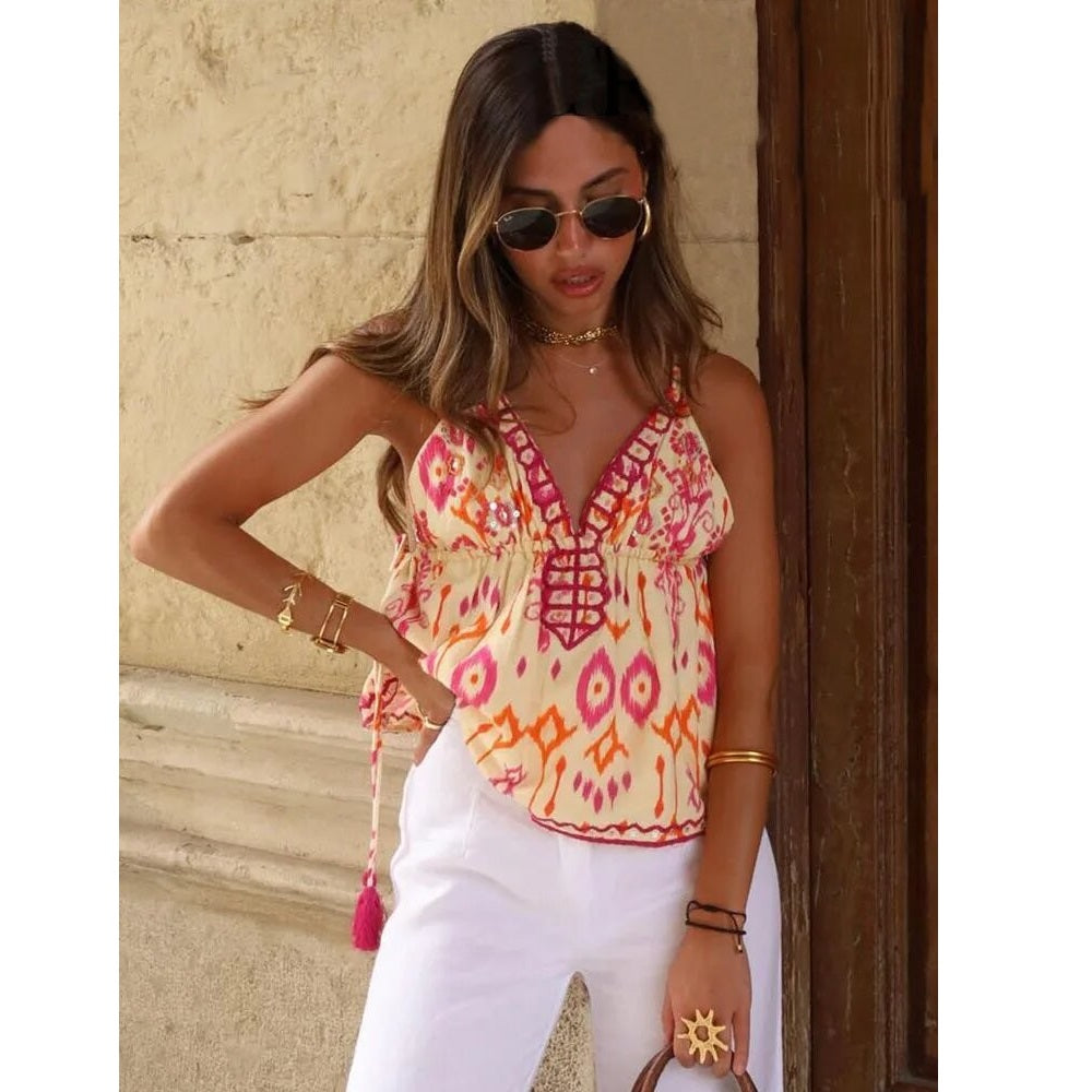 تتميز هذه البلوزة بدون أكمام بنمط مستوحى من الفن الأزتيكي وألوانها الزاهية. خفيفة وسلسة، إنها مثالية للأيام المشمسة، تجمع بين الراحة والأناقة غير الرسمية.