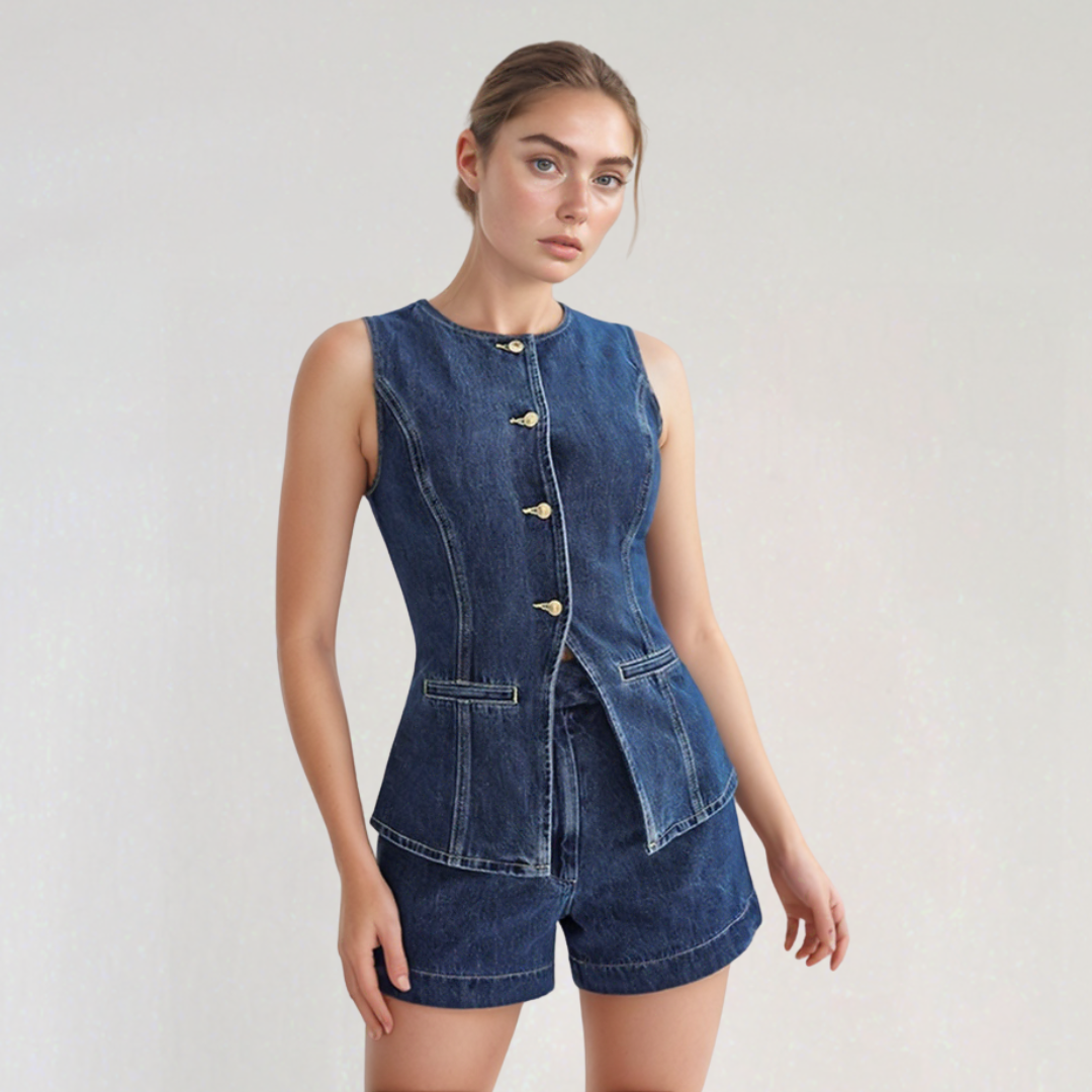 تتضمن هذه المجموعة سترة بلا أكمام مصممة مع أزرار ذهبية وجيوب أمامية. الشورت عالي الخصر يوفر قصّة مريحة ومثالية.