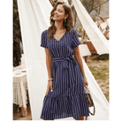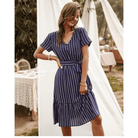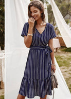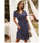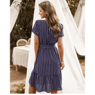 עם הגוון הכחול כהה, הצווארון בצורת V והחגורה הקשורה, השמלה הקצרה הזו משקפת בצורה מושלמת את רוח ההיפי שיק. החיתוך האסימטרי מוסיף נגיעה מודרנית בעדינות. אידיאלית לערב רומנטי או לבריחה קיץ.