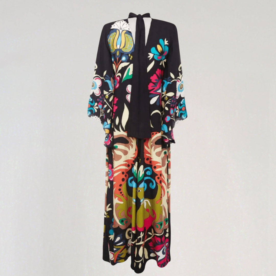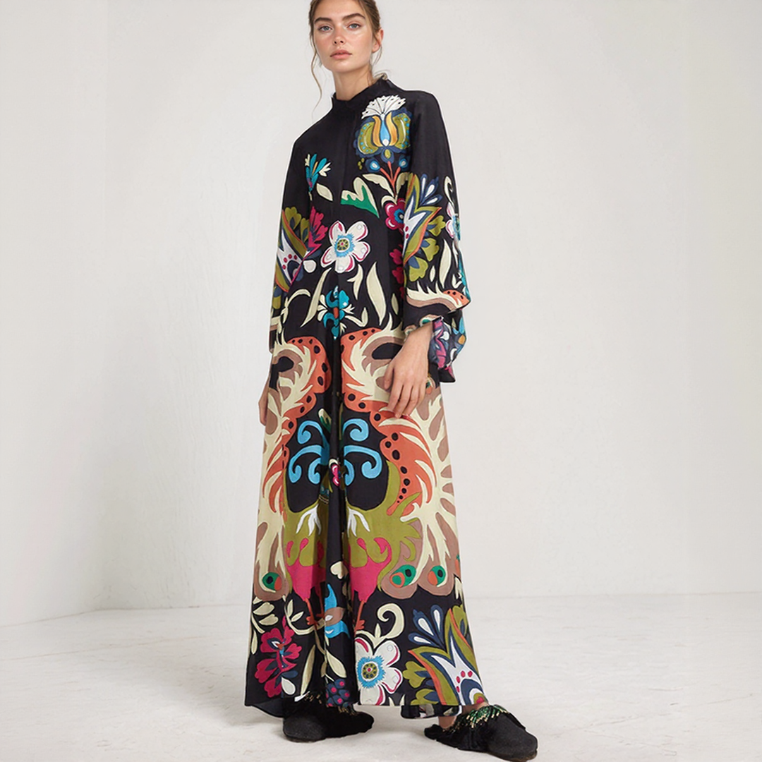 このロングドレスは大胆な花柄と流れるようなシルエットを特徴としています。背中のリボンディテール付きのハイネックが洗練された印象を与えます。すべての季節にぴったりで、時代を超えたボヘミアンエレガンスを提供します。