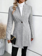 このウエストを絞ったロングジャケットは、スタイルと洗練を兼ね備えています。フィット感のあるカットはシルエットを引き立て、オフィスでも街中でも完璧なモダンなルックを提供します。
