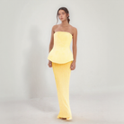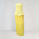 Dette settet kombinerer en strapless crop top som fremhever skuldrene med et langt, plisserte skjørt som faller lett. Perfekt for elegante anledninger, det forener moderne raffinement og komfort gjennom hele dagen.