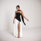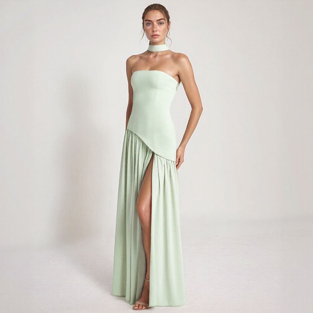 Deze lange jurk accentueert de silhouet dankzij de gestructureerde en strapless corset. De zijsplit voegt een vleugje vrouwelijkheid en zelfvertrouwen toe. Ideaal voor elegante avonden, het combineert charme en comfort.